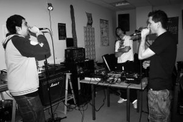 ENSAYO De izda. a dcha., los componentes del grupo tudelano: Raúl Barcos ("Kinda), Samuel Alonso (Dj Lento) y Rubén Navarro ("Burdo Bardo).