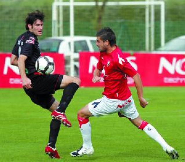 Portillo pugna con un jugador del Mirandés en el amistoso de ayer. EDUARDO BUXENS