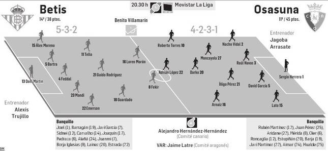 En el Betis será baja por sanción uno de los fijos en las alineaciones sevillanas en su decepcionante temporada, Sergio Canales, aunque en contrapartida podrá contar con otro de sus jugadores franquicia, el francés Nabil Fekir que ha cumplido un partido por acumulación de amonestaciones.