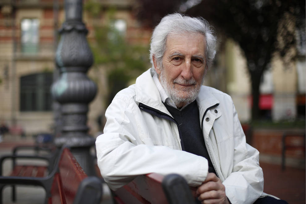Juan Luis Beltrán Aguirre, sentado en un banco de la plaza San Francisco de Pamplona.